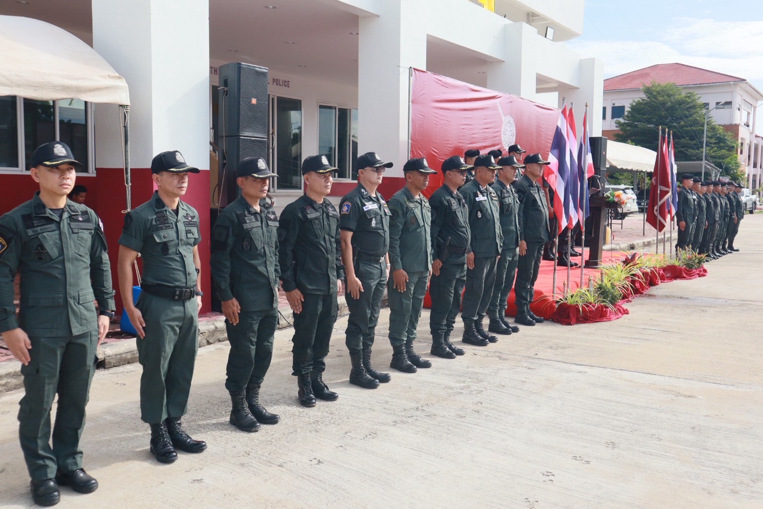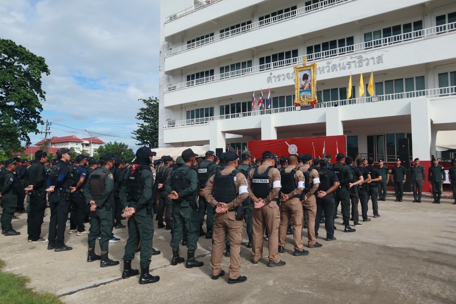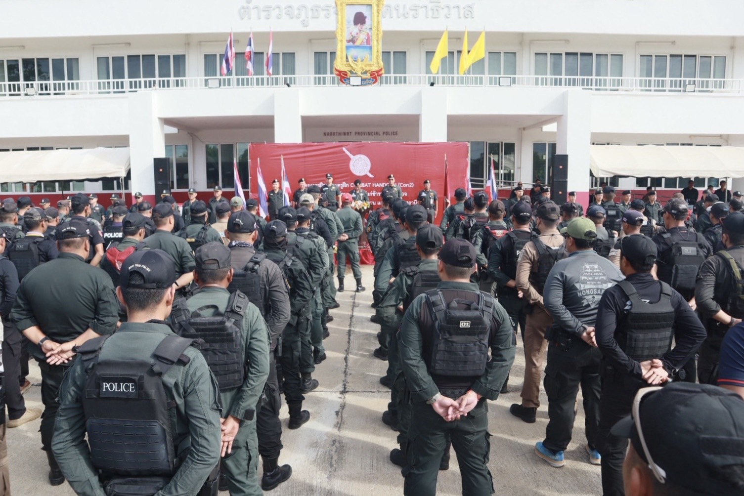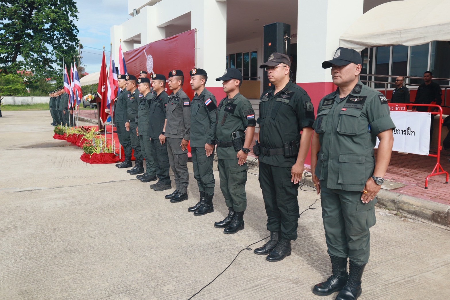 พร้อมด้วย ผกก.สส.ฯ, ผกก.ปพ.ฯ, ผกก.ฝอ.ฯ, หน.สภ.ในสังกัดฯ และ ขรก.ตร.ผู้เข้ารับการฝึกอบรมฯ ร่วมในพิธีฯ ณ ลานหน้าอาคารที่ทำการ ภ.จว.นราธิวาส ต.โคกเคียน อ.เมืองนราธิวาส จว.นราธิวาส
