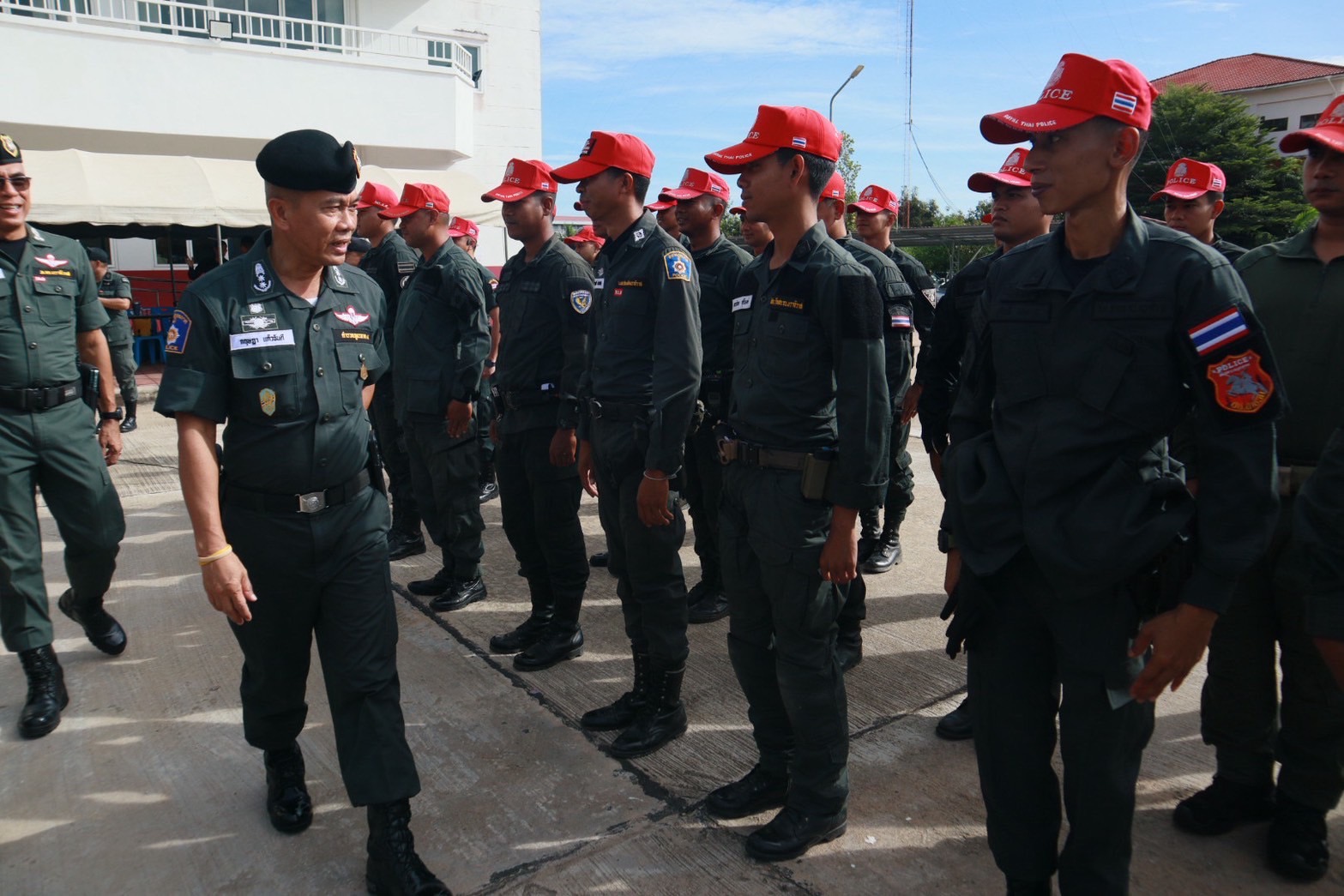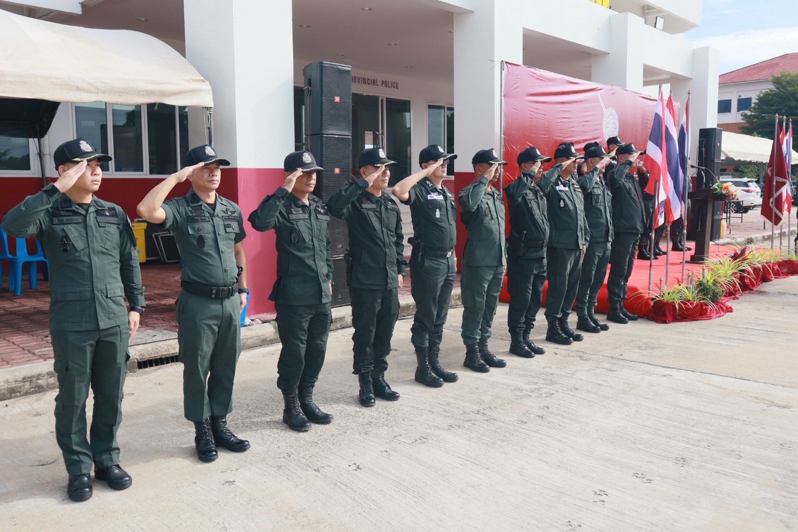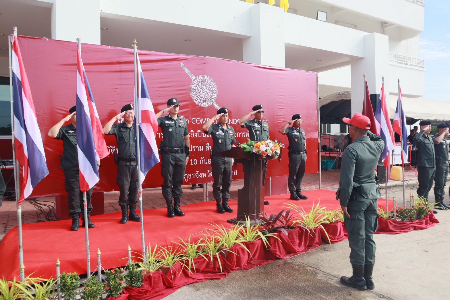 พร้อมด้วย ผกก.สส.ฯ, ผกก.ปพ.ฯ, ผกก.ฝอ.ฯ, หน.สภ.ในสังกัดฯ และ ขรก.ตร.ผู้เข้ารับการฝึกอบรมฯ ร่วมในพิธีฯ ณ ลานหน้าอาคารที่ทำการ ภ.จว.นราธิวาส ต.โคกเคียน อ.เมืองนราธิวาส จว.นราธิวาส