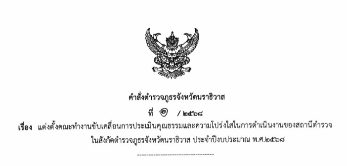 แต่งตั้งคณะทำงานขับเคลื่อนการประเมินคุณธรรมและความโปร่งใสในการดำเนินงานของสถานีตำรวจ ในสังกัด ภ.จว.นราธิวาส ปีงบฯ 2568